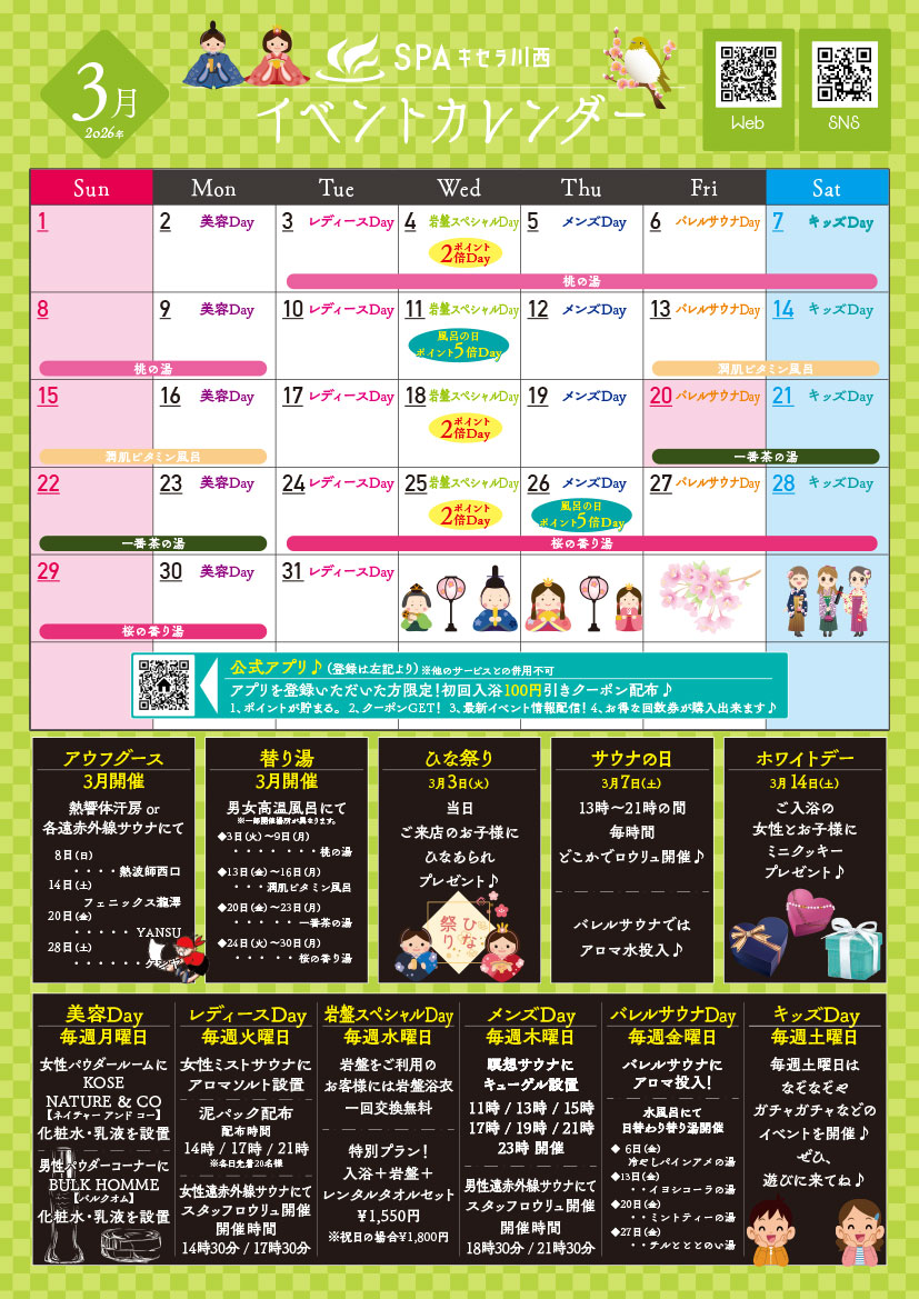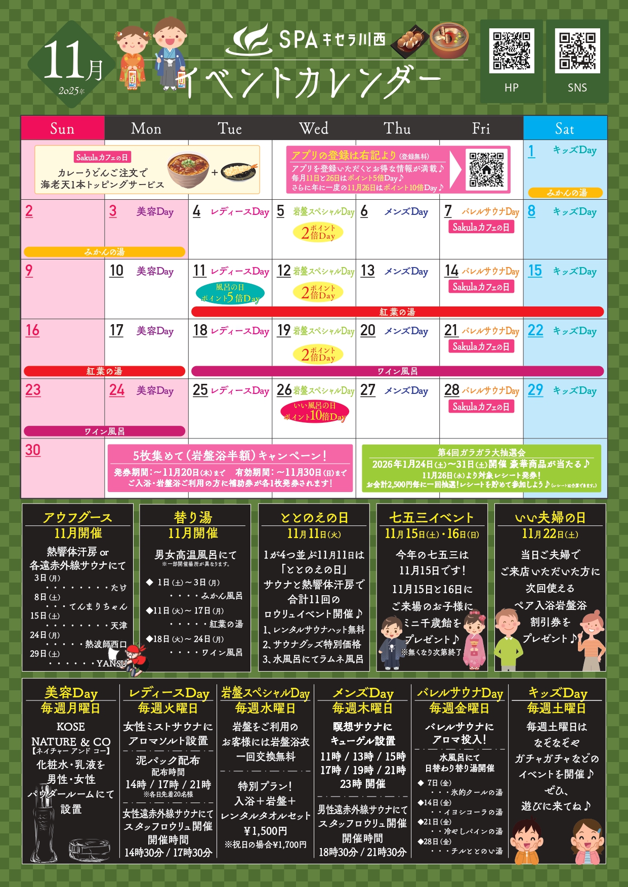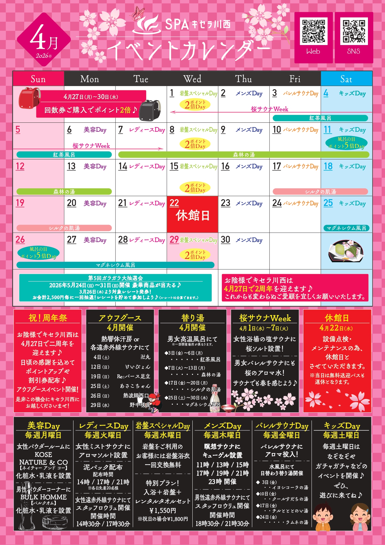 6種のお風呂や、4種のサウナ・岩盤浴などの施設も充実のスパ・温浴施設「SPAキセラ川西」。