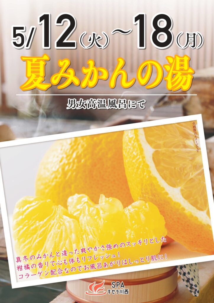 5/12~5/18 夏みかんの湯 2026.04.8 5/12(火)~5/18(月)の7日間限定で、 男女高温風呂にて、【夏みかんの湯】を開催いたします! 期間限定の替り湯となっておりますので、ぜひご来店下さい♪ 5/8~5/11 母の日ブーケの湯 前の記事 5/22~5/25 カモミールの湯 次の記事