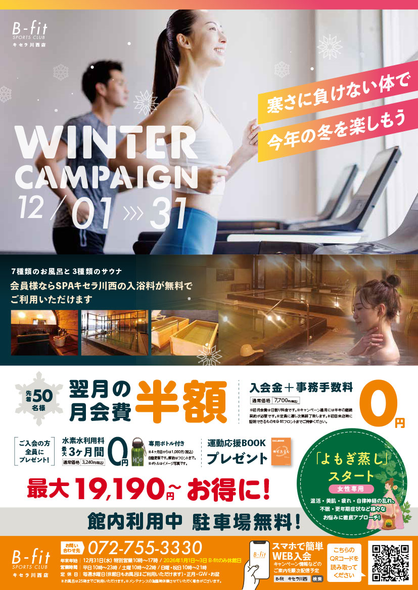 SPAキセラ川西内にあるフィットネスジム「B-fit(ビィフィット)スポーツクラブ キセラ川西店」の、12月のお得な入会キャンペーンをご案内します。