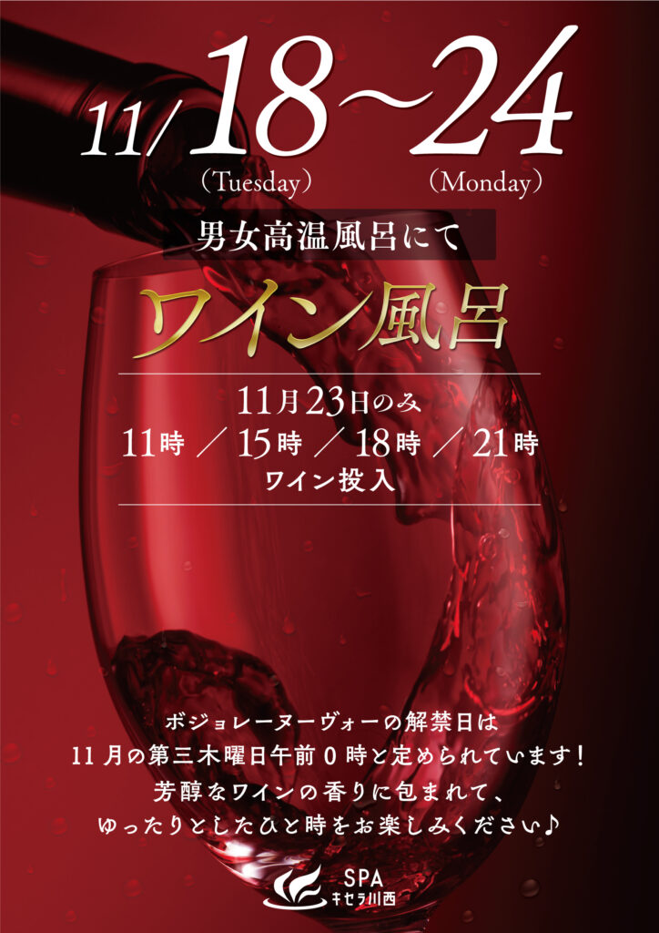 ワイン風呂2025.10.911/18(火)~11/24(月)の7日間限定で、【ワイン風呂】を開催いたします✨期間限定の替り湯をお楽しみください♪ 紅葉の湯 前の記事 [期間限定]巨峰スムージー 次の記事
