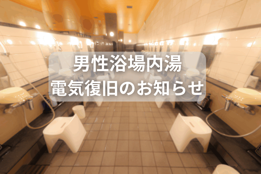 男性浴場内湯の電気復旧のお知らせ2025.11.29お客様各位SPAキセラ川西の男性浴場内湯の電気が復旧致しました。 お客様には長い間ご迷惑をおかけいたしました事、お詫び申し上げます。 またお客様のご来店を心よりお待ちしております。 12/1 【瞑想サウナ】ストーブ修繕工事のお知らせ 前の記事