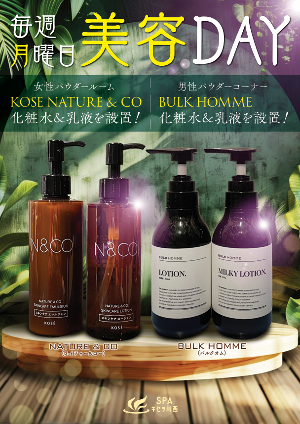 美容デー【毎週月曜日】2025.03.22 毎週月曜日は【美容デー】です♪・大好評のKOSE『NATURE&CO』の化粧水と乳液を女性パウダールームにて設置いたします!・人気スキンケアブランド『バルクオム』の化粧水と乳液を男性脱衣所にて設置いたします! 桜サウナウィーク 前の記事 レディースデー【毎週火曜日】 次の記事
