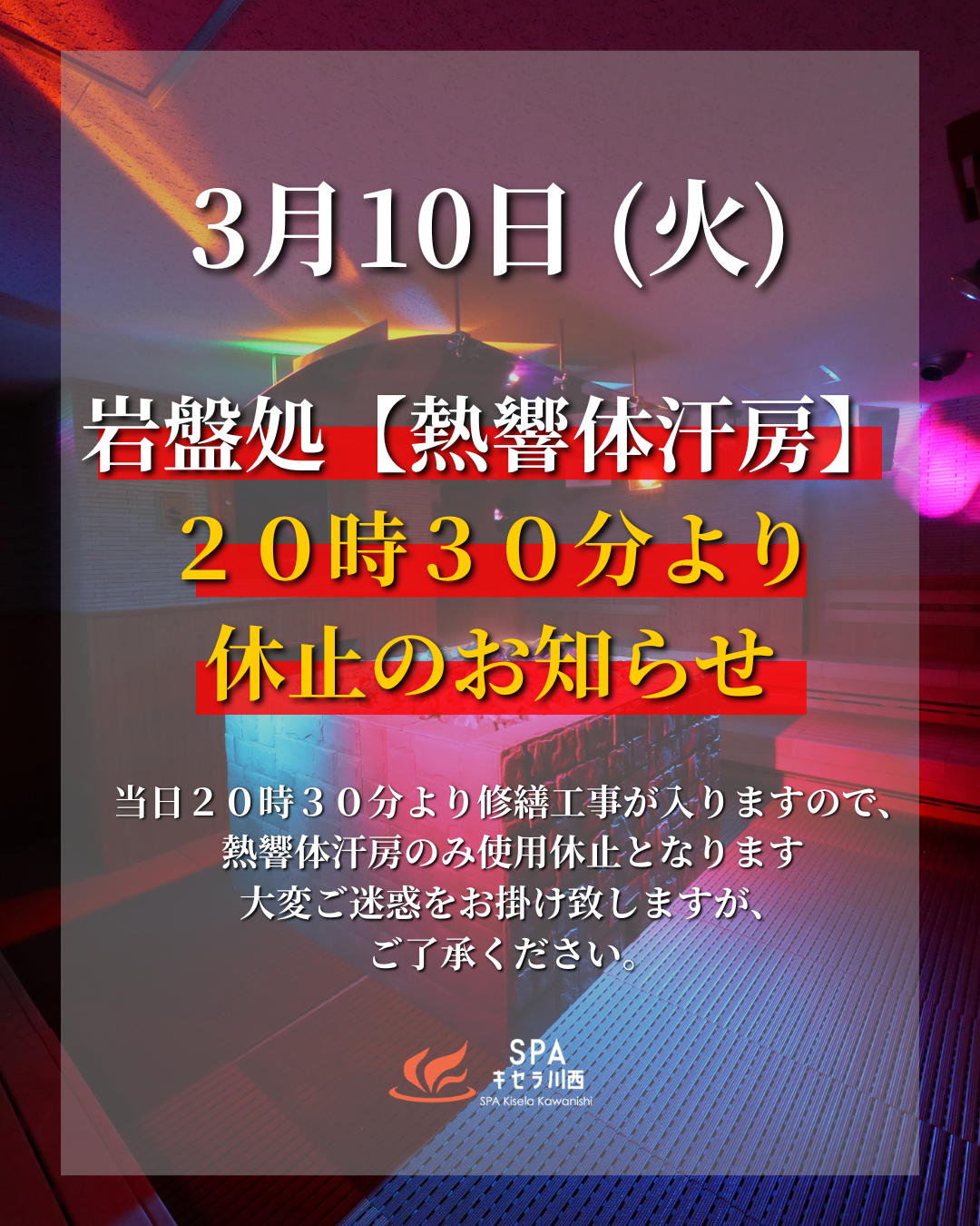 3/10(火)20時30分~「熱響体汗房」使用休止2026.03.9岩盤処「熱響体汗房」は修繕工事の為、下記の休止期間の通り運転を休止致します。 お客様には大変ご迷惑をお掛け致しますが、何卒ご理解の程お願い申し上げます。[休止期間] 2026年3月10日(火)20時30分 ~ 閉店 Post Share Hatena Pin it 4/22(水)休館日のお知らせ 前の記事