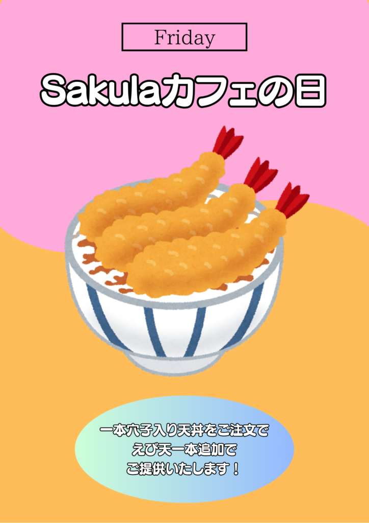 毎週金曜日!さくらカフェの日!2026.03.18毎週金曜日はさくらカフェの日!一本穴子入り天丼をご注文で「えび天」一本追加でご提供いたします!金曜日はさくらカフェで美味しいごはんを食べよう! 3/10(火) 20:30~ 【熱響体汗房 休止のお知らせ】 前の記事